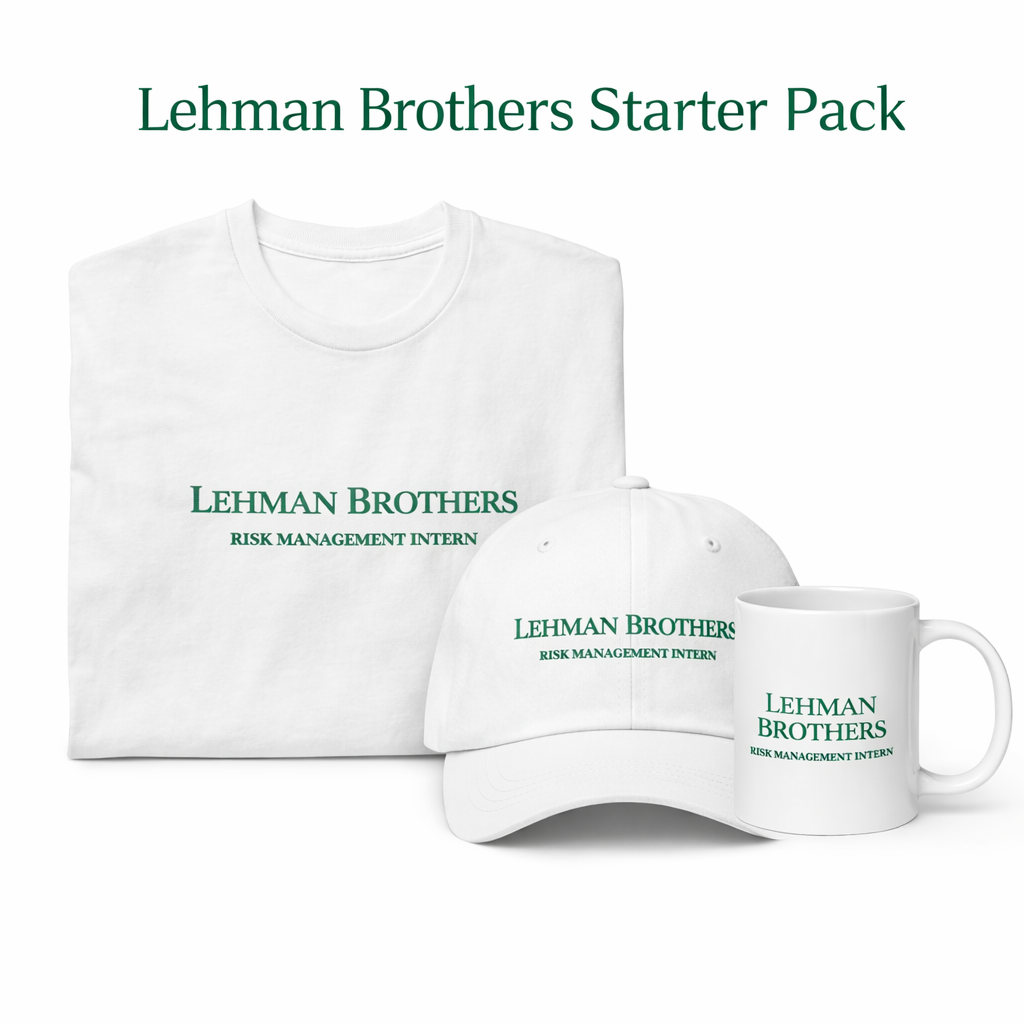 Dieses Set ist für alle, die Crashs studieren, Risiken feiern und Ironie dort tragen, wo andere nur rote Kerzen sehen. Mit dem Lehman Brothers Starter Pack zeigst du, dass du Märkte verstehst – oder zumindest ihre besten Memes.